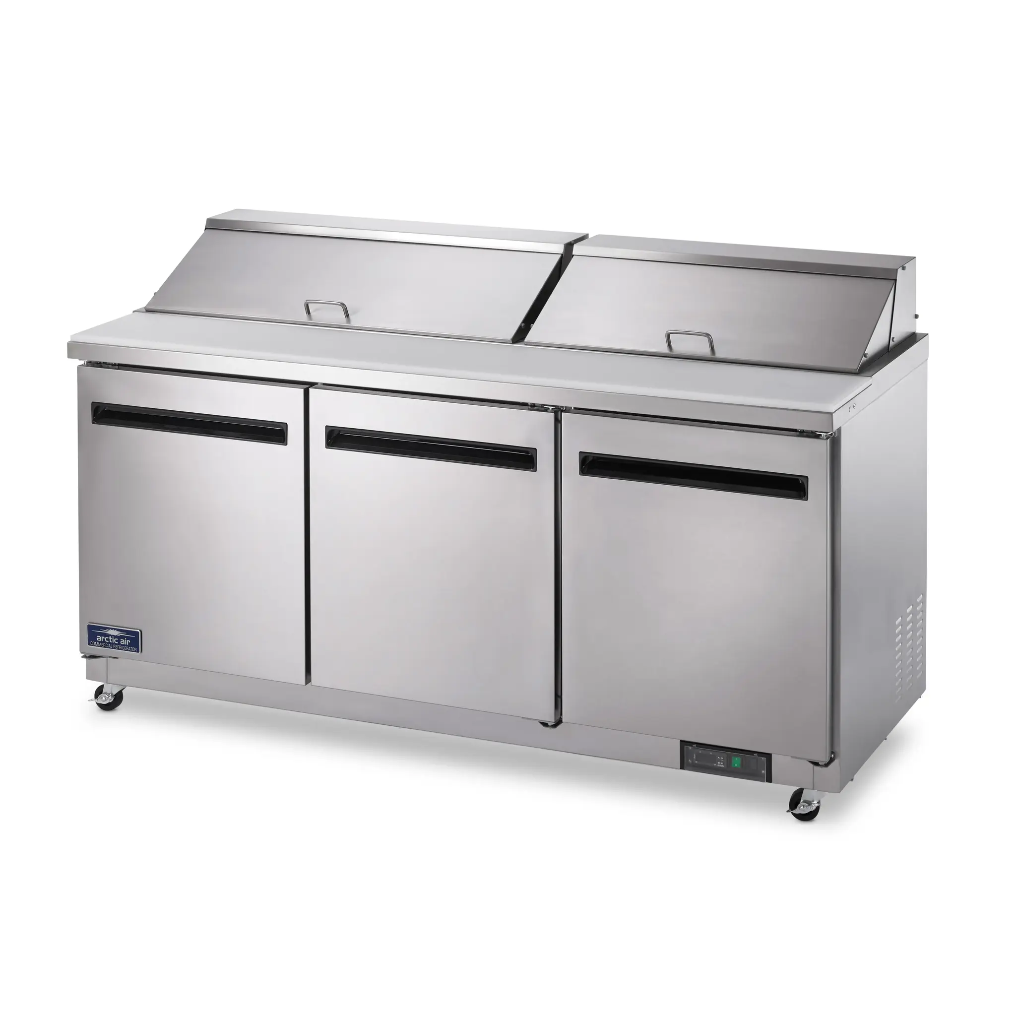 Crafted for excellence in refrigeration, the Arctic Air AMT72R Refrigerated Counter is the perfect addition to any commercial restaurant. With its three-section design and 72" width, this unit offers a spacious 18 cu. ft. capacity, providing ample storage for all your ingredients. The rear-mounted self-contained refrigeration system ensures efficient cooling, while the electronic thermostat with a digital LED temperature display allows for precise temperature control. Equipped with a full-length cutting board and (27) 1/6 pans, this mega top sandwich/salad unit offers convenient food preparation and organization. The three solid self-closing doors and shelves provide easy access to your stored items. Made with stainless steel front and sides, this unit is durable and easy to clean. With its R290 Hydrocarbon refrigerant and 1/2 HP compressor, this unit is energy-efficient and environmentally friendly. Upgrade your restaurant's refrigeration capabilities with the Arctic Air AMT72R Refrigerated Counter.