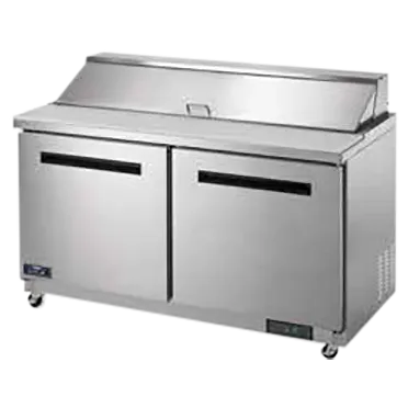 Sip sophistication, redefine freshness with the Arctic Air AST60R Refrigerated Counter, Sandwich / Salad Unit. This two-section prep table is designed to meet the demands of a commercial restaurant setting, ensuring your ingredients stay cool and ready for use. The rear-mounted self-contained refrigeration system, coupled with the electronic thermostat and digital LED temperature display, allows for precise temperature control. The stainless steel top features an 11.5-inch deep cutting board, providing ample space for food preparation. With 16 included 1/6 size pans, you can easily organize and access your ingredients. The two solid hinged self-closing doors and shelves offer convenient storage options. The white ABS interior with a stainless steel floor is easy to clean and maintain. Equipped with four 3-inch casters, including two locking ones, this unit is mobile and can be easily moved around your kitchen. Upgrade your restaurant's efficiency and freshness with the Arctic Air AST60R Refrigerated Counter, Sandwich / Salad Unit.