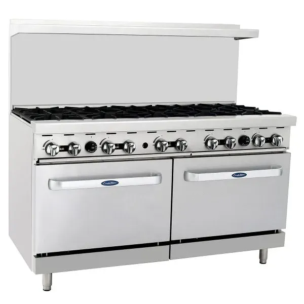 Ignite culinary passion with the Atosa USA AGR-10B 60" Gas Range (10 Burner). This commercial-grade range is designed to meet the demands of a busy restaurant kitchen. With its 10 powerful 32,000 BTU open burners, you can easily cook multiple dishes at once, increasing efficiency and productivity. The removable cast iron top grates provide even heat distribution and are easy to clean. The range also features two spacious 26-1/2" ovens, each with adjustable chrome oven racks, allowing you to bake and roast with precision. The stainless steel construction of the front, back, sides, kick plate, back guard, and over shelf ensures durability and easy maintenance. Equipped with a pilot light and drip tray, this range is not only efficient but also safe to use. With a total of 374,000 BTUs, the Atosa USA AGR-10B is a reliable and high-performance addition to any commercial kitchen.