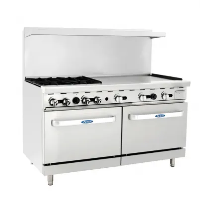 Streamline your restaurant cooking operations with the Atosa USA AGR-4B36GR 60" Combination Gas Range. This high-quality range is designed to meet the demands of a busy commercial kitchen. With its four 32,000 BTU open burners, you can easily cook multiple dishes at once, while the standing pilots ensure quick and reliable ignition. The 36" polished steel griddle on the right provides a versatile cooking surface for searing steaks, grilling sandwiches, and more. The two 26-1/2" ovens feature adjustable chrome racks, allowing you to bake and roast with precision. Safety is a top priority with the oven pilot and safety shut off. Made with durable stainless steel, this range is built to withstand the rigors of a commercial kitchen. The casters make it easy to move and clean, while the drip tray helps keep your workspace clean and organized. Trust Atosa USA for reliable and efficient cooking equipment.