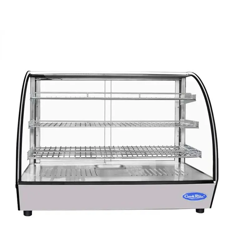 Countertop Heated Display Case - Curved,5.6 Cu Ft w/ 3 SS Shelves w/ 2 Rear Sliding Glass Doors Dimensions: 35-2/5 W * 22-1/10 D * 26-2/5 H,Stainless steel exterior & interior,Removable water pan to add humidity,Electronic digital controller,Three(3) stainless steel shelves standard,Maintains temperatures between 86 F 194 F,Magnetic door gasket(s) standard for positive door seal,Two(2) rear sliding glass doors,LED interior lighting,Leveling legs,NEMA 5-15 plug with 5 cord