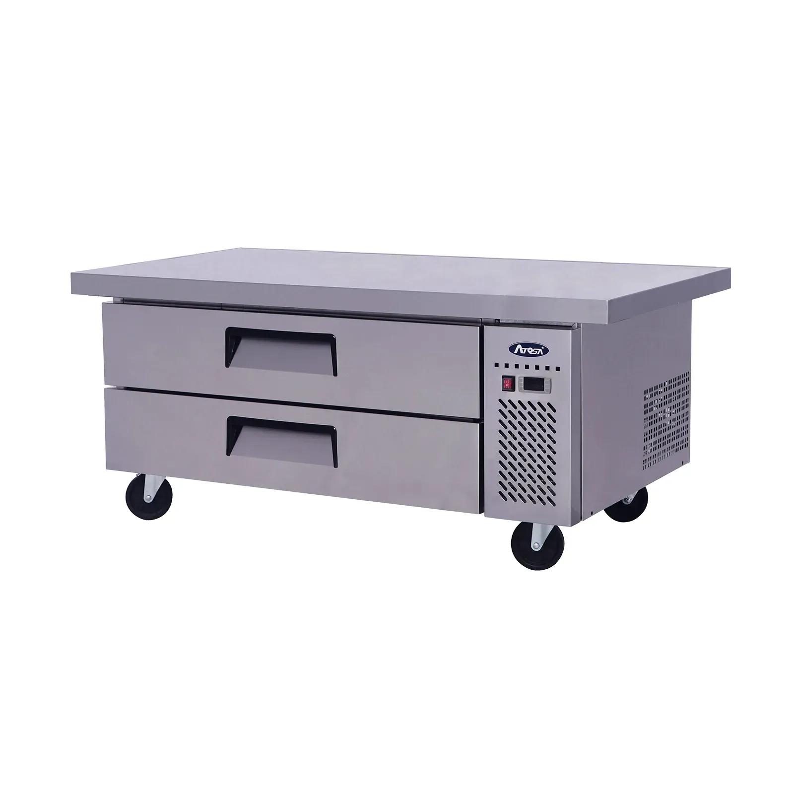 Unleash gastronomic brilliance with the Atosa USA, MGF8452GR Equipment Stand, Refrigerated Base. This one-section chef base is designed to elevate your restaurant's efficiency and productivity. With its extended top, measuring 60-1/2"W x 33"D x 26-3/5"H, it provides ample space for food preparation and storage. The side-mounted self-contained refrigeration ensures optimal cooling, maintaining a temperature range of 34° to 40°F. The unit features two self-closing drawers with recessed handles, allowing for easy access to ingredients and supplies. Included are six 12 x 20 stainless steel pans, perfect for organizing and storing various ingredients. The stainless steel interior and exterior not only provide durability but also make cleaning a breeze. Equipped with 5" casters, this chef base is easy to maneuver and transport. Powered by a 1/7 HP motor, it operates quietly and efficiently. Trust Atosa USA to deliver high-quality equipment that meets the demands of a busy commercial restaurant.