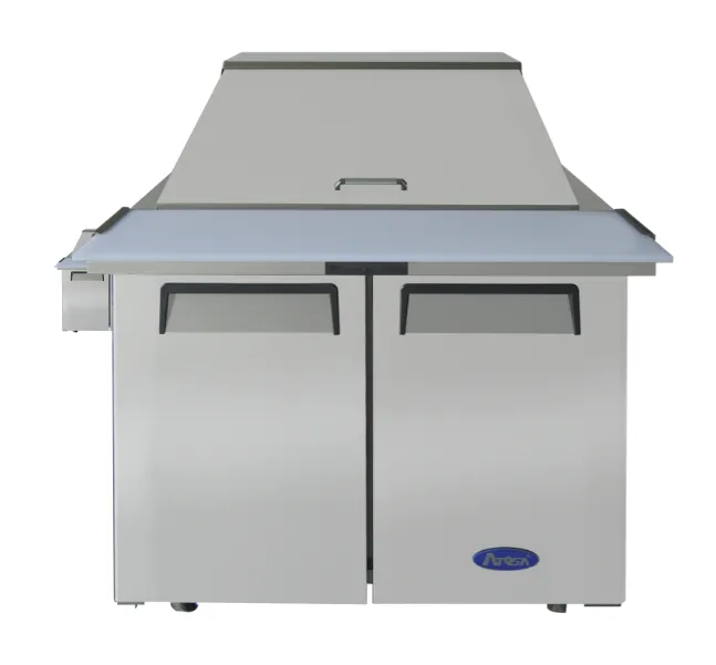 Mobilize your kitchen with the Atosa USA, MSF3615GR Sandwich Prep Table. This two-section mega top refrigerator is designed to meet the demands of a busy commercial restaurant. With its spacious 8.7 cu. ft. capacity, it includes 15 stainless steel pans for easy organization and access to your sandwich and salad ingredients. The rear-mounted, self-contained refrigeration system ensures efficient cooling, while the digital temperature control allows you to set the perfect temperature between 33° to 40°F. The two solid hinged self-closing doors and adjustable shelves provide convenient storage options. The 10" poly cutting board offers a convenient workspace for food preparation. Made with a stainless steel interior and exterior, as well as a galvanized steel back, this prep table is built to withstand the rigors of a commercial kitchen. With its automatic evaporation and air defrost features, maintenance is a breeze. The 5" casters make it easy to move and clean the unit. Trust Atosa USA to deliver reliable and durable equipment for your restaurant.