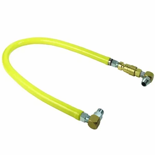 The Gas Flex Hose comes equipped with a quick disconnect feature, allowing for easy and swift disconnection and reconnection of gas lines, which is particularly useful during maintenance or equipment relocation. Additionally, the inclusion of two elbows ensures that the hose can be maneuvered into tight spaces, making it adaptable to various kitchen layouts.