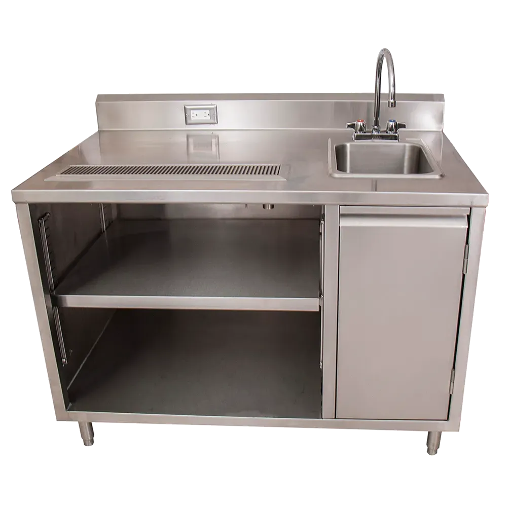 Fuel your restaurant's success with the BK Resources BEVT-3060R Beverage Counter. This high-quality beverage table is designed to meet the demands of a busy commercial restaurant. The 60"W x 30"D stainless steel top provides ample space for preparing and serving drinks, while the 14" x 10" sink on the right side, complete with a gooseneck faucet, allows for easy cleanup. The built-in 24" urn trough with drain is perfect for holding and draining hot beverage urns. With a hinged door under the sink and an adjustable shelf, you'll have plenty of storage space for supplies. The 5" riser backsplash features a standard electric outlet, making it convenient to plug in blenders or other equipment. The stainless steel legs ensure stability and durability, and the NSF certification guarantees the highest standards of cleanliness and safety. Upgrade your beverage station with the BK Resources BEVT-3060R Beverage Counter and watch your restaurant thrive.