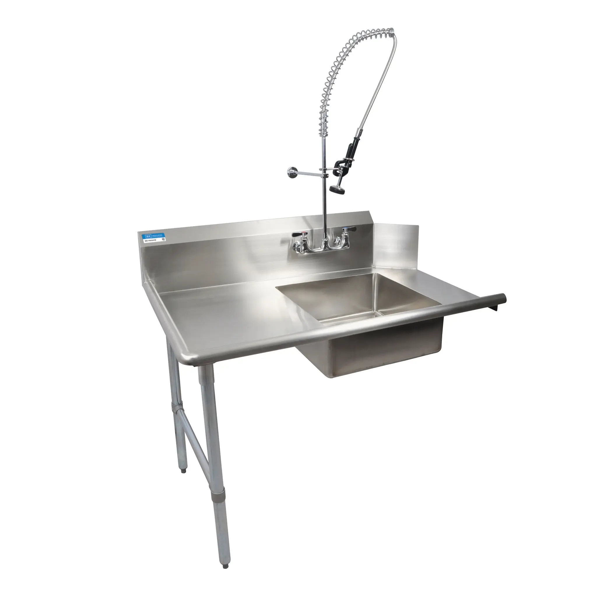 Deliver food perfection with the BK Resources BKSDT-72-L-SS-P-G Dishtable. This soiled dishtable is designed to meet the demands of a busy commercial restaurant. With its straight design and dimensions of 72"W x 30-3/8"D x 46-1/4"H, it provides ample space for efficient operation. The 18/304 stainless steel top ensures durability and easy cleaning, while the 20" x 20" x 8" deep pre-rinse sink and 8" OC splash mount pre-rinse faucet (BKF-SMPR-WB-G) make it convenient for prepping and cleaning dishes. The raised rolled edges on the front and sides, along with the 10"H backsplash, help contain spills and splashes. This dishtable also includes a basket drain (BKDR-4) for added convenience. With stainless steel legs and side bracing, as well as stainless steel over plastic adjustable bullet feet, it offers stability and durability. NSF certified, this BK Resources dishtable is a reliable choice for any commercial restaurant.