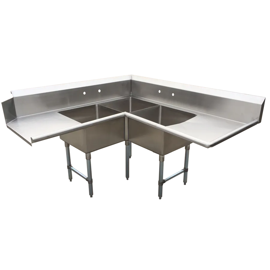 Craft culinary wonders with the BK Resources, BKSDT-CO3-2012-RS Dishtable with Potsinks. This corner design soiled dishtable is perfect for commercial restaurant use, offering convenience and efficiency. With its three compartments, measuring 20" wide x 20" front-to-back x 12" deep, you'll have plenty of space to handle all your dishwashing needs. The 18/304 stainless steel top ensures durability and easy cleaning, while the stainless steel legs and side bracing provide stability and support. The dishtable also features a 10" backsplash and two sets of 8" OC splash mount faucet holes, making it easy to install and use. Included with the dishtable are three BKDR-4 basket drains, two BK-SDTS tray guides, and one BK-PRB-5 pre-rinse basket, providing everything you need for a seamless dishwashing process. Trust BK Resources for high-quality, reliable restaurant equipment.