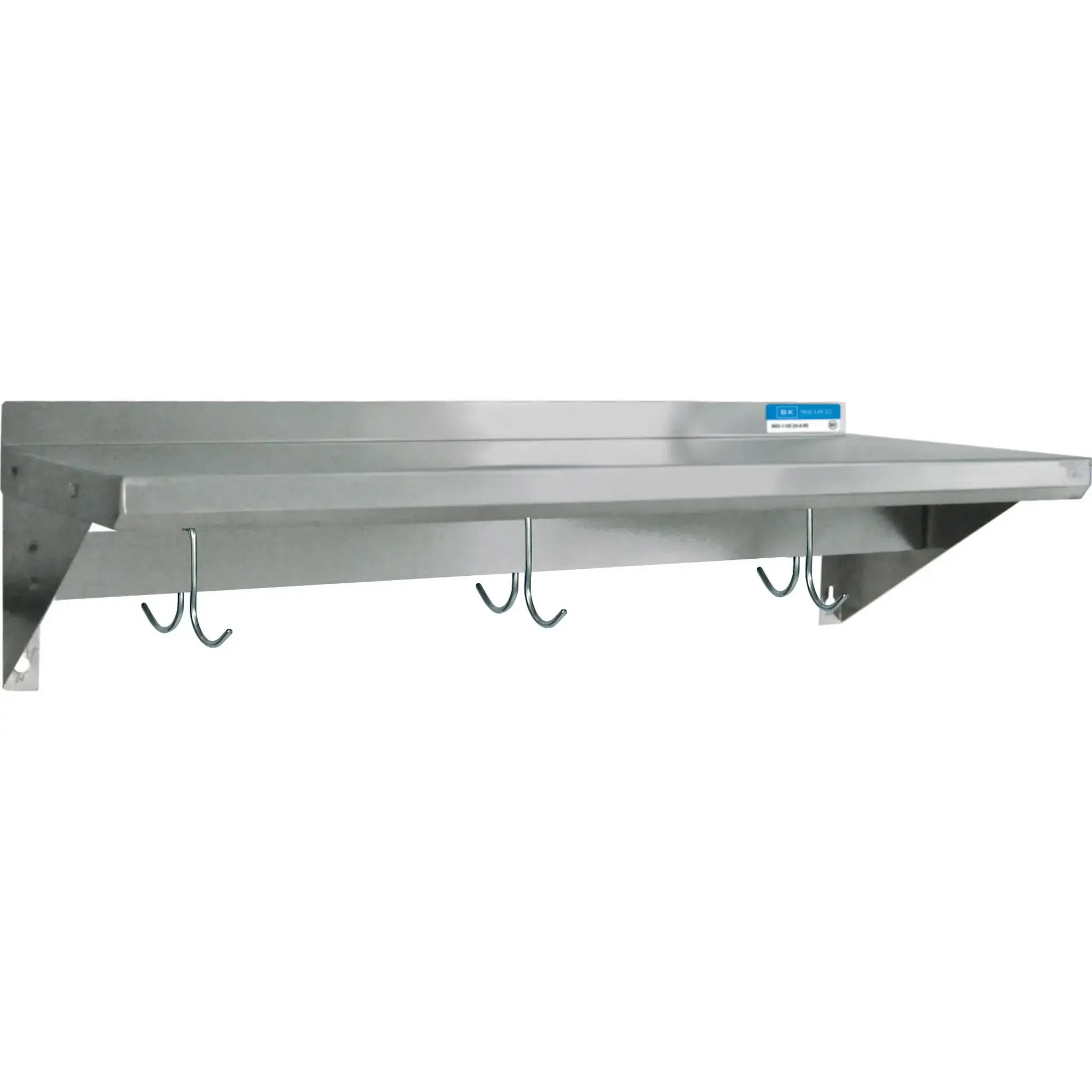 Maximize your food service potential with the BK Resources, BKWSE-1260-PR Overshelf, Wall-Mounted with Pot Rack. This economy overshelf is designed to enhance the efficiency and organization of your commercial restaurant kitchen. Made of durable 18/430 stainless steel, it is built to withstand the demands of a busy kitchen environment. The 60"W x 12"D size provides ample space for storing and displaying essential kitchen items, while the 1-1/2"H rear up-turn prevents items from falling off the shelf. The two 8" angle supports ensure stability and strength, allowing you to hang pots and pans securely on the six stainless steel double prong hooks included. This NSF-certified overshelf is not only practical but also meets the highest standards of sanitation. Trust BK Resources, a reputable vendor in the industry, to provide you with a reliable and functional overshelf that will streamline your kitchen operations.