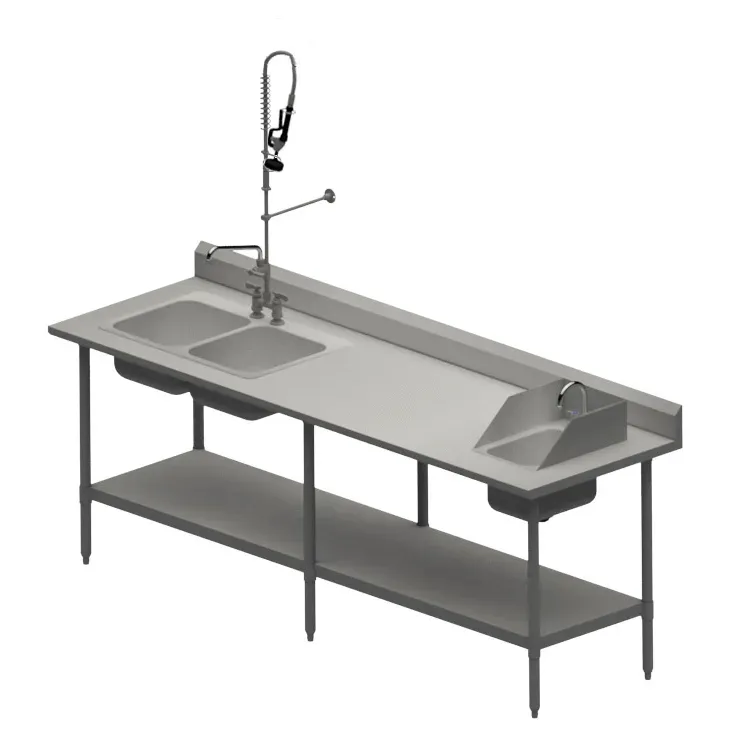 Cook with confidence using the BK Resources MOD-PT Work Table with Prep Sink(s). This versatile and durable work table is designed specifically for commercial restaurant use. With its 96"W x 30"D size, it provides ample space for food preparation and includes a CVTR5-9630 work table with an undershelf for convenient storage. The MOD-PT also features a DDI2-14161024 two-compartment sink, perfect for washing and rinsing dishes, and a BKF-4HDDPR-WB-G pre-rinse assembly with a 10" add-on faucet and wall bracket for easy cleaning. Additionally, it comes with a DDI-10141024S-P-G hand sink with faucet and side splashes, ensuring proper hygiene in the kitchen. Made of 16/304 stainless steel, this work table is not only durable but also easy to clean. With its stainless steel adjustable legs and feet, you can customize the height to suit your needs. Trust BK Resources, a reputable vendor in the industry, and invest in the MOD-PT Work Table with Prep Sink(s) for your commercial restaurant.