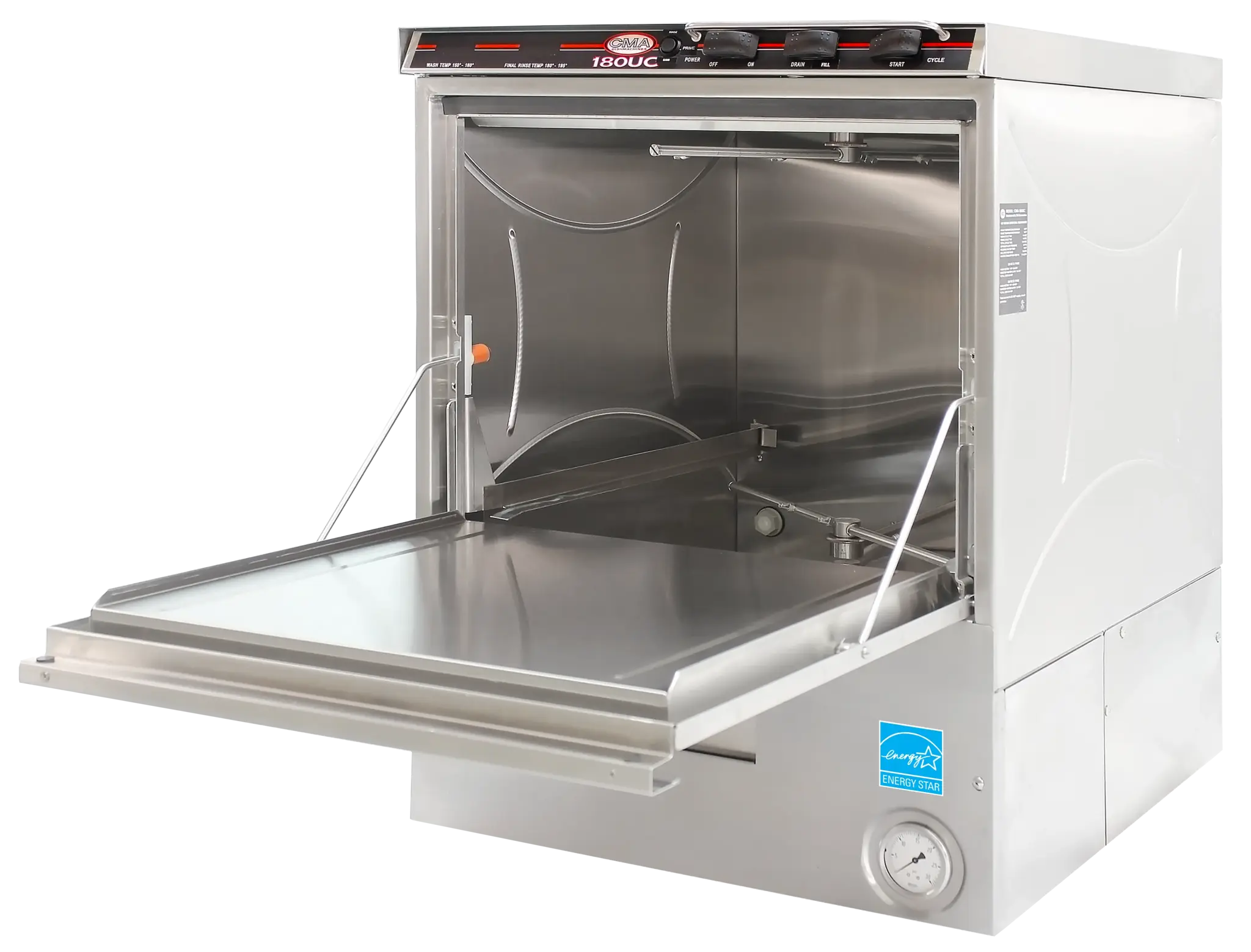 Introducing the CMA Dishmachines, 180C, Dishwasher, Door Type - the perfect solution to simplify restaurant operations. This high-quality dishwasher is designed to meet the demands of a busy commercial restaurant, offering efficiency and convenience. With its corner design and compact dimensions of 25-1/2"W x 25"D x 60"H, it optimizes space utilization in your kitchen. The high-temperature sanitizing feature ensures that your dishes are thoroughly cleaned and sanitized, meeting the highest hygiene standards. The top-mounted control box allows for easy operation and monitoring, while the external Poly Pro scrap accumulator helps to keep your dishwasher clean and free from debris. The stainless steel construction ensures durability and longevity, making it a reliable investment for your restaurant. With a capacity of 60 racks per hour, this dishwasher can handle high volumes of dishes, saving you time and effort. Additionally, it is ENERGY STAR certified, ensuring energy efficiency and cost savings. Upgrade your restaurant's dishwashing capabilities with the CMA Dishmachines, 180C, Dishwasher, Door Type.