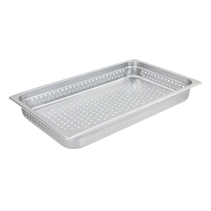 Transform your kitchen with top-of-the-line cooking gear. Introducing the Crestware 5002P Steam Table Pan, Stainless Steel. Designed for commercial restaurant use, this steam table pan is a game-changer in the kitchen. Made from 18/8 stainless steel, it is built to withstand the demands of a busy kitchen while maintaining its sleek appearance. The 2-1/2" depth and perforated design allow for efficient steam cooking, ensuring your dishes are cooked to perfection every time. The Saf-T-Rim and flat edge provide a secure grip and prevent spills, while the jam reduction shoulder makes it easy to stack and store multiple pans. NSF certified and Saf-T-Stak compatible, it meets the highest standards of safety and convenience. Upgrade your kitchen with the Crestware 5002P Steam Table Pan and experience the difference in quality and performance.