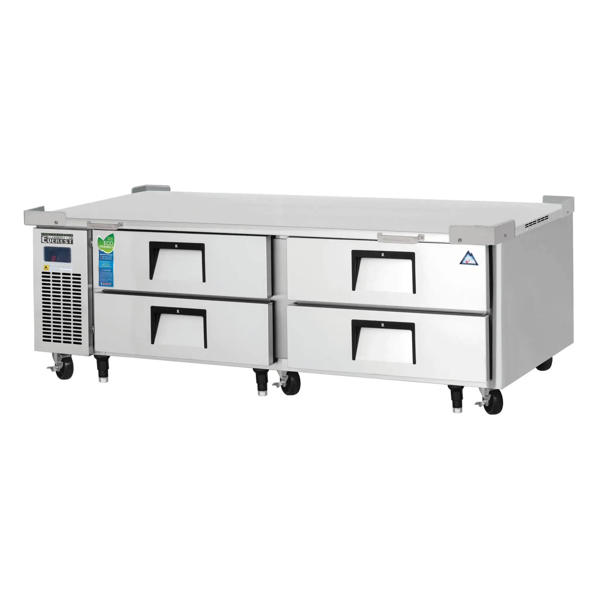 Cook with confidence with the Everest Refrigeration ECB72D4 Equipment Stand, Refrigerated Base. This two-section chef base refrigerator is designed to meet the demands of a busy commercial restaurant kitchen. With four heavy-duty stainless steel drawers, it offers ample storage space for your ingredients and supplies. The 16 gauge stainless steel worktop provides a durable and hygienic surface for food preparation. The digital controls with LED display make it easy to adjust and monitor the temperature, ensuring your ingredients stay fresh and safe. The auto defrost feature saves you time and effort, while the dual air chamber and vents ensure even cooling throughout the unit. The high heat insulation and stainless steel grips enhance energy efficiency and ease of use. With its NSF and ETL-Sanitation certifications, you can trust the quality and safety of this refrigerated base. Upgrade your kitchen with the Everest Refrigeration ECB72D4 and experience the convenience and reliability it brings to your restaurant operations.