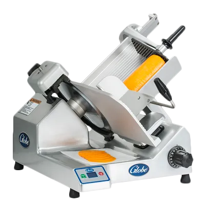 Take your kitchen to the next level with the Globe SG13 Food Slicer. This premium heavy-duty advanced slicer is a must-have for any commercial restaurant. With its 13" steel knife and LCD display, this slicer offers precise and efficient slicing every time. The top-mounted removable sharpener with synthetic diamond surfaces ensures that the knife stays sharp for optimal performance. The knife cover interlock and interlocked tilting carriage provide added safety during operation. The auto off feature with adjustable timer allows for convenient and energy-saving operation. Made in the USA, this slicer boasts a seamless anodized aluminum base and a 1/2 HP knife motor for durability and reliability. Whether you're slicing meats, cheeses, or vegetables, the Globe SG13 Food Slicer is the perfect addition to your commercial kitchen.