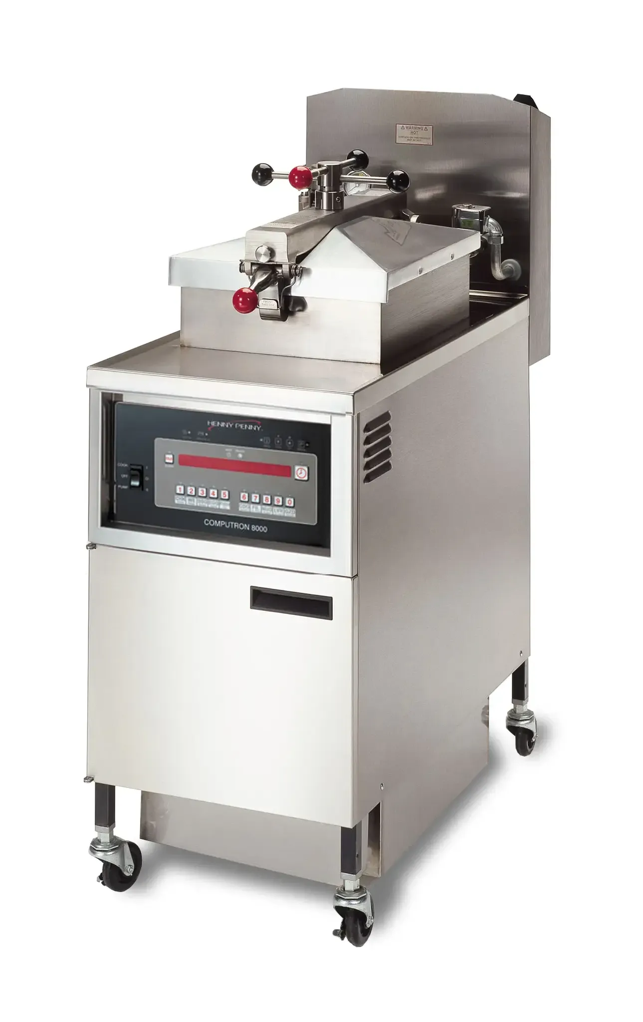 Frying under pressure enables lower cooking temperatures for longer oil life, and faster cooking times to meet peak demand. The PFG 600 gas pressure fryer's fast recovery translates into higher throughput, lower energy costs and longer frying oil life. Henny Penny pressure fryers have a patented lid lock and color-keyed spindle that make it easy to create a perfect pressure seal every time. A built-in filtration system filters and returns hot frying oil in minutes. No separate pumps and pans, no handling hot oil. The Computron™ 8000 control features automatic, programmable operation, as well as energy-saving, filtration and cook management functions.