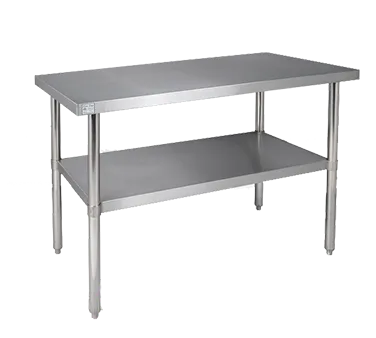 Modernize operations with the Klingers Trading 16GA-AST3060 Work Table. This versatile table is designed for commercial restaurant use, offering a durable and functional solution to streamline your kitchen operations. The 16/430 stainless steel top with turned-down edges ensures easy cleaning and prevents spills from dripping onto the floor. Reinforced with three hat channels, this table provides exceptional strength and stability, making it perfect for heavy-duty tasks. The stainless steel undershelf and legs offer additional storage space for your kitchen essentials, keeping everything within reach for efficient workflow. With adjustable bullet feet, you can easily level the table on uneven surfaces. Whether you need a prep station, a place to assemble ingredients, or a sturdy surface for equipment, the Klingers Trading 16GA-AST3060 Work Table is the ideal choice for modernizing your restaurant operations.