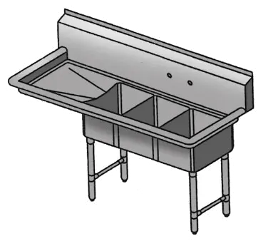 Upgrade your restaurant workflow with the innovative Klingers Trading CON3DL Sink. This three-compartment convenience/deli sink is designed to enhance efficiency and productivity in commercial restaurant settings. Made from durable 18/304 stainless steel, this sink is built to withstand the demands of a busy kitchen. The three 10"W x 14" front-to-back x 10" deep compartments provide ample space for washing, rinsing, and sanitizing dishes, while the 8-1/2"H backsplash helps maintain a clean and hygienic environment. The sink also features a 12" left drainboard and three 3-1/2" drain baskets for easy disposal of waste. With its 8" OC splash mount faucet holes and stainless steel legs, crossbracing, and feet, this sink is NSF certified and meets the highest standards of quality and safety. Upgrade your restaurant's efficiency and cleanliness with the Klingers Trading CON3DL Sink.