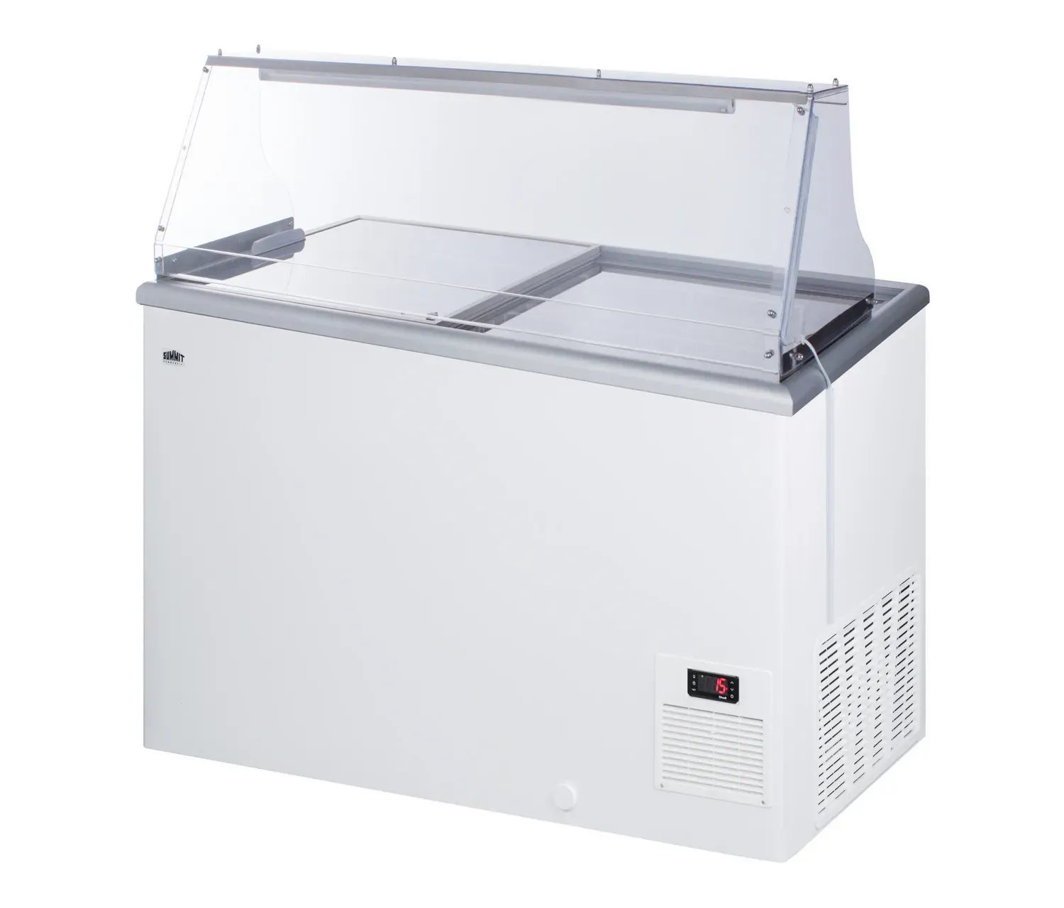 Ensure reliability with the Summit Appliance NOVA35PDC Chest Freezer. This 11.7 Cu.Ft. dipping cabinet is perfect for commercial restaurant use. Made in Europe, this fully assembled dipping cabinet boasts a spacious 43" width, providing ample storage space for your frozen treats. The digital thermostat ensures precise temperature control, allowing you to maintain the perfect consistency of your ice cream, gelato, or sorbet. The sneezeguard feature adds an extra layer of hygiene, protecting your frozen treats from contamination. Additionally, the built-in light illuminates the cabinet, making it easy to showcase your delicious offerings to customers. With its commercial-grade construction and reliable performance, the Summit Appliance NOVA35PDC Chest Freezer is a must-have for any restaurant looking to serve frozen desserts. Trust in Summit Appliance for all your commercial refrigeration needs.