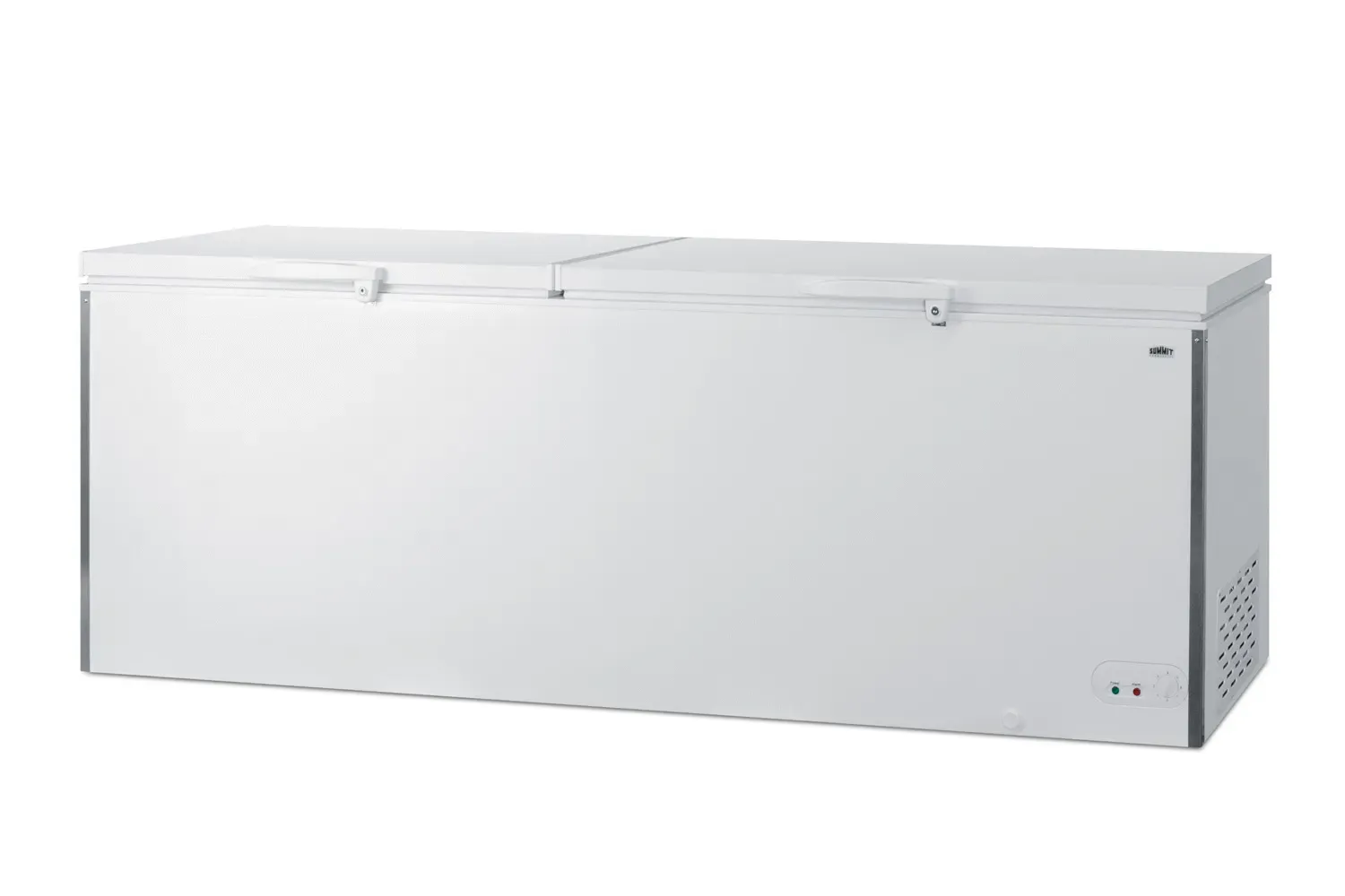 Streamline workflow with the Summit Appliance SCFM252WH Chest Freezer. This commercially listed chest freezer is designed to meet the demands of a busy restaurant kitchen. With a spacious 26.66 cu.ft capacity, it provides ample storage space for all your frozen ingredients and prepared dishes. The manual defrost feature allows for easy maintenance and ensures optimal performance. The white exterior with stainless steel corner guards not only adds a sleek and professional look to your kitchen but also enhances durability. Whether you need to store large quantities of meat, seafood, or frozen desserts, this chest freezer has got you covered. Its reliable performance and efficient cooling system ensure that your ingredients stay fresh and ready for use. Invest in the Summit Appliance SCFM252WH Chest Freezer and experience the convenience and reliability it brings to your commercial restaurant operation.