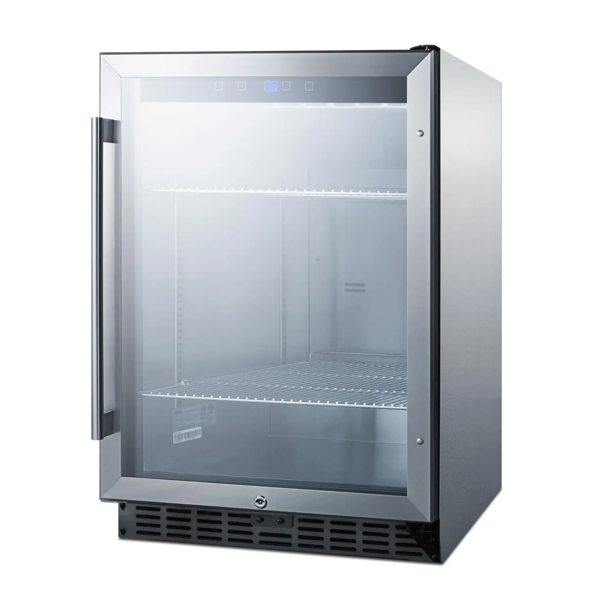 Streamline workflow with the Summit Appliance SCR611GLOS Refrigerator Merchandiser. Designed for commercial restaurant use, this one-section reach-in unit offers a spacious 5.0 cu. ft. capacity, perfect for storing and displaying a variety of food and beverages. The bottom mount self-contained refrigeration system ensures efficient cooling, while the reversible hinged glass door with a lock provides easy access and security. With three adjustable chrome shelves and LED lighting, you can showcase your products in an attractive and organized manner. The automatic defrost and digital thermostat make maintenance a breeze, while the stainless steel exterior and interior ensure durability and cleanliness. This refrigerator merchandiser operates on R600a Hydrocarbon refrigerant, making it environmentally friendly. UL, cETL, and ETL-Sanitation certified, it meets the highest industry standards. Upgrade your restaurant's refrigeration capabilities with the Summit Appliance SCR611GLOS Refrigerator Merchandiser.