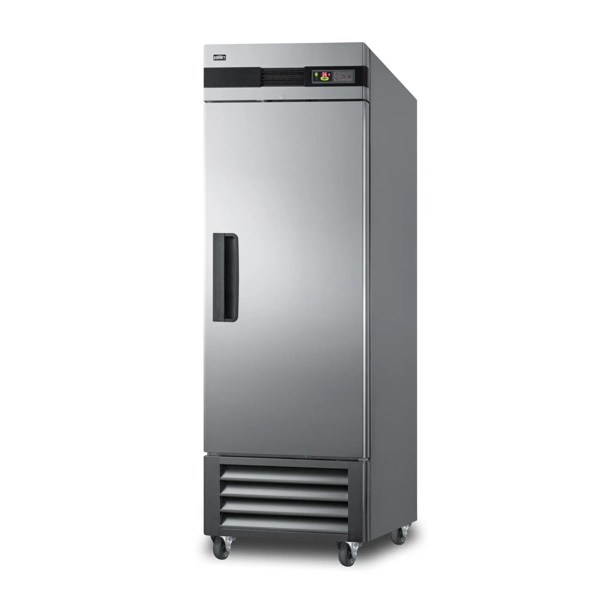 Enhance versatility with the Summit Appliance SCRR232 Refrigerator, Reach-In. This one-section reach-in refrigerator offers a spacious 23 cu. ft. capacity, perfect for commercial restaurant use. The right-hinged self-closing solid door comes with a lock for added security. The interior light illuminates the stainless steel interior, making it easy to find and organize your ingredients. With four adjustable wire shelves, you can customize the storage space to fit your needs. The open door alarm and temperature alarm ensure that your food stays at the optimal temperature at all times. The forced-air cooling and digital thermostat provide precise temperature control, while the automatic defrost feature saves you time and effort. Equipped with four casters, including two locking ones, this refrigerator is easy to move and secure in place. Trust in the reliability and efficiency of the Summit Appliance SCRR232 Refrigerator, Reach-In for your restaurant's refrigeration needs.