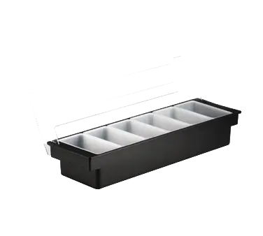 Upgrade your kitchen capabilities with the TableCraft Products, 102, Bar Condiment Holder. This sleek and practical condiment holder is designed specifically for commercial restaurant use. With its 19-1/2" x 6" x 4-1/4" dimensions, it provides ample space to store and organize all your bar condiments. The holder comes with six 1-pint white inserts, allowing you to separate and display different condiments for easy access. The clear lid keeps everything fresh and protected, while the dishwasher-safe ABS plastic construction ensures durability and easy cleaning. The black color adds a touch of sophistication to any bar setup. Whether you're running a busy bar or a bustling restaurant, this Bar Condiment Holder from TableCraft Products is a must-have for efficient and stylish condiment storage. Upgrade your kitchen today and elevate your restaurant's service to the next level.
