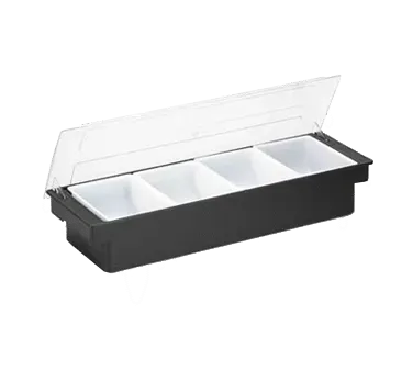 Introducing the TableCraft Products, 103, Bar Condiment Holder, a must-have for elevating your restaurant's reputation. This sleek and practical condiment holder is designed to meet the demands of a commercial restaurant setting. With its 19-1/2" x 6" x 4-1/4" dimensions, it offers ample space to organize and display various condiments, ensuring easy access for your staff and customers. The holder comes with four 1-1/2-pint white inserts, allowing you to store a variety of condiments simultaneously. The clear lid not only keeps the condiments fresh but also allows for quick identification. Made from durable ABS plastic, this holder is dishwasher safe, making cleaning a breeze. Its black color adds a touch of sophistication to your restaurant's decor. With a minimum order of just one, this Bar Condiment Holder from TableCraft Products is a practical and stylish addition to any commercial restaurant, helping you streamline your operations and enhance the dining experience for your customers.