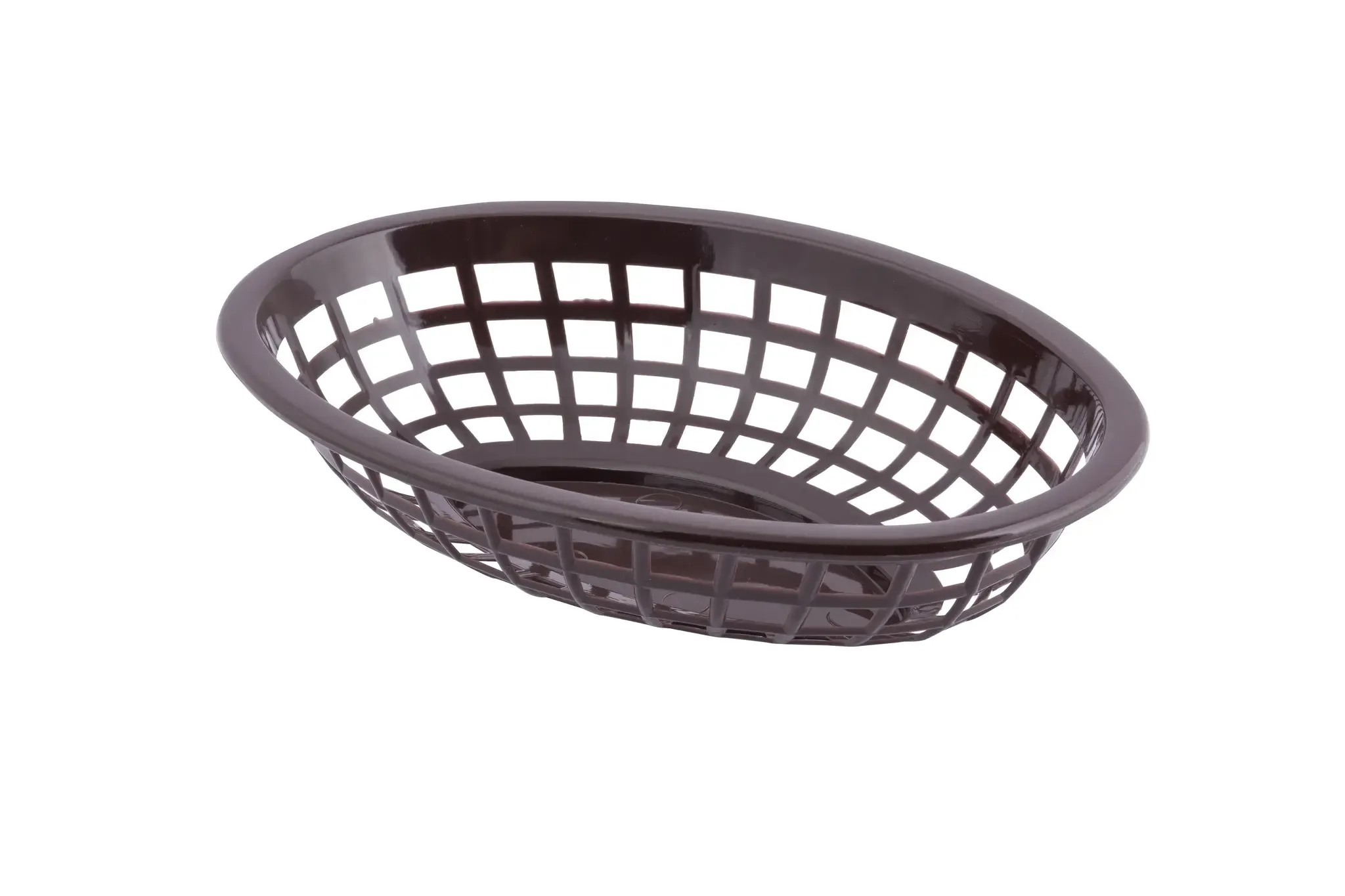 Stay ahead in culinary excellence with TableCraft Products' 1071BR Fast Food Basket. Designed for commercial restaurant use, this oval side order basket is a must-have for any food establishment. With dimensions of 7-3/4" x 5-1/2" x 1-7/8", it provides ample space for serving fries, onion rings, and other delicious sides. Made from heat-resistant polyethylene, this basket can withstand temperatures up to 150F/65C, making it perfect for use under heat lamps or in the dishwasher and microwave. The brown color adds a touch of sophistication to any table setting. Made in the USA by TableCraft Products, this Fast Food Basket combines durability, functionality, and style to enhance your restaurant's dining experience. Order now and elevate your food presentation to the next level.