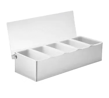 Elevate ambiance design with the TableCraft Products, 1605, Bar Condiment Holder. This stainless steel condiment holder is a must-have for any commercial restaurant. With its sleek and modern design, it adds a touch of sophistication to any bar or dining area. The holder features five compartments, providing ample space for storing and organizing condiments such as ketchup, mustard, and relish. The acrylic lid keeps the condiments fresh and protected from contaminants. Dishwasher safe, this condiment holder is easy to clean and maintain, saving valuable time and effort. The compact size of 15" x 5-3/4" x 3-1/2" ensures it can fit on any bar or countertop without taking up too much space. Trust TableCraft Products, a reputable vendor in the industry, to deliver quality and durability with their Bar Condiment Holder.