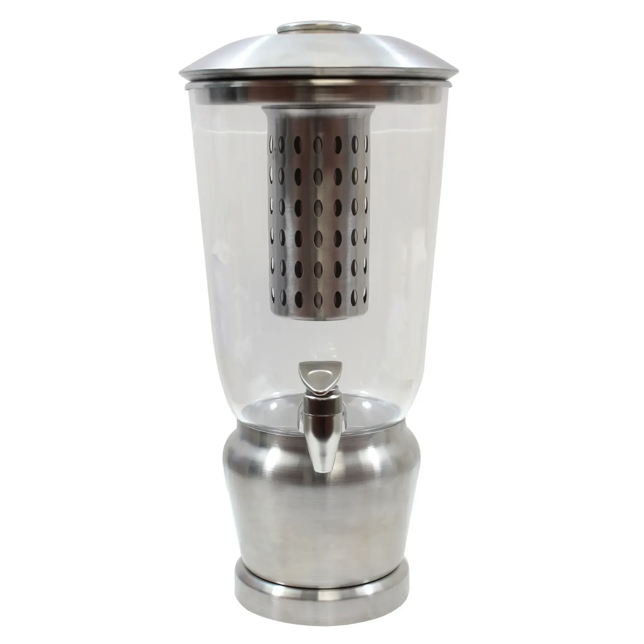 Invest in culinary excellence with the TableCraft Products, 7515, Beverage Dispenser, Non-Insulated. This high-quality dispenser is designed to meet the demands of commercial restaurant use, ensuring that your beverages are served with style and efficiency. The 1-1/4 gallon capacity allows for ample servings, while the BPA-free Tritan reservoir guarantees the safety of your drinks. The removable stainless steel infuser allows you to add flavor and variety to your beverages, making it perfect for creating signature drinks that will impress your customers. The stainless steel double wall base with a brushed finish not only adds a touch of elegance to your establishment but also provides durability and insulation to keep your beverages at the perfect temperature. With its ice core and lid, this dispenser is ready to serve refreshing drinks all day long. Elevate your beverage service with the TableCraft Products, 7515, Beverage Dispenser, Non-Insulated.