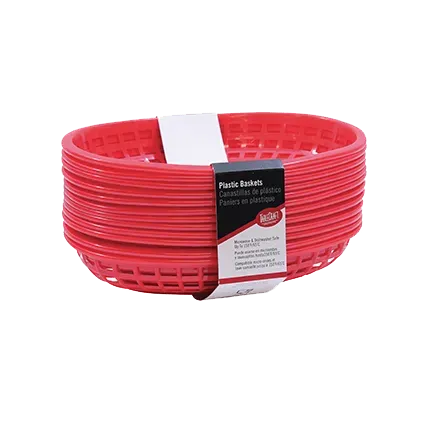 Set your restaurant apart with the TableCraft Products, C1074R Fast Food Basket. Made in the USA, this classic oval basket is designed to enhance the dining experience in commercial restaurants. With dimensions of 9-3/8" x 6" x 1-7/8", it provides ample space for serving a variety of dishes. The heat-resistant plastic construction ensures durability and allows the basket to withstand temperatures up to 150F/65C, making it suitable for use with heat lamps, dishwashers, and microwaves. The vibrant red color adds a pop of excitement to any table setting. Elevate your presentation and impress your customers with this high-quality fast food basket from TableCraft Products.