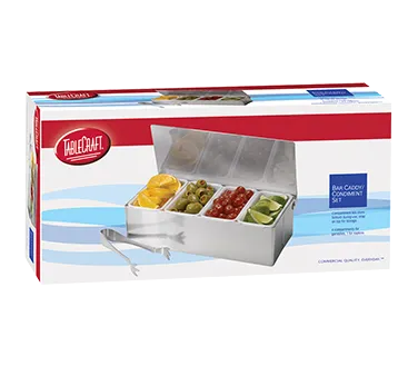 Create a seamless dining experience with the TableCraft Products, H1604 Bar Condiment Holder. This cash and carry bar caddy set is perfect for commercial restaurant use, offering convenience and organization. The set includes a 4-compartment holder insert and tongs, allowing you to neatly store and serve condiments to enhance your customers' dining experience. Made of durable stainless steel, this bar condiment holder is dishwasher safe, ensuring easy cleaning and maintenance. The acrylic lid not only keeps the condiments fresh but also allows for easy visibility, making it effortless to restock when needed. Elevate your bar service and keep your condiments within reach with the TableCraft Products, H1604 Bar Condiment Holder.