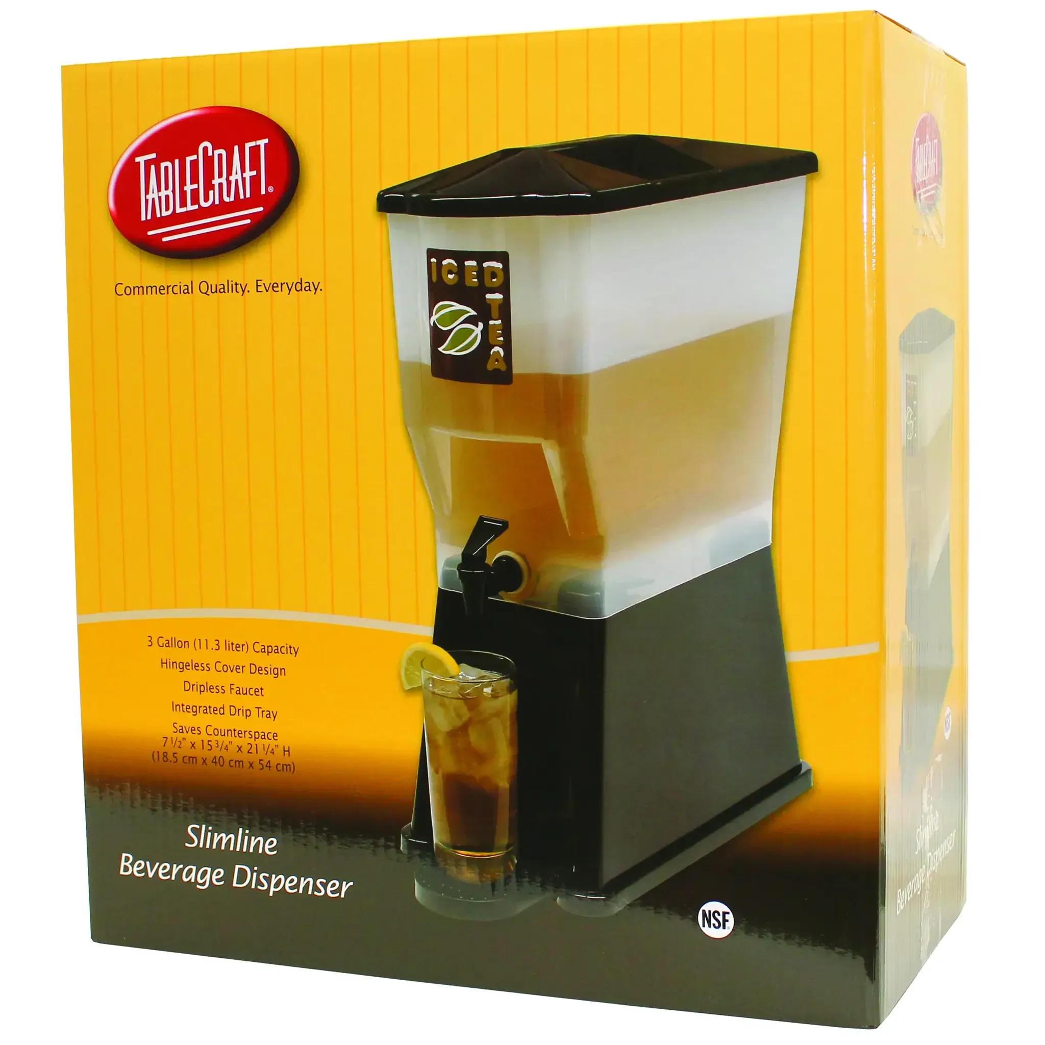 Introducing the TableCraft Products H353DP Beverage Dispenser, Non-Insulated. Set standards for excellence in your commercial restaurant with this sleek and efficient beverage dispenser. Designed by TableCraft Products, a trusted name in the industry, this dispenser is perfect for serving refreshing drinks to your customers. With a capacity of 3 gallons, it can accommodate a large volume of beverages, ensuring that your guests never go thirsty. The slimline design allows for easy placement on countertops or beverage stations, while the 8-1/4" faucet clearance ensures hassle-free dispensing. Made from durable materials, this dispenser is built to withstand the demands of a busy restaurant environment. The black color adds a touch of sophistication to any setting. Purchase this dispenser in multiples of 2 each, as it comes in a display merchandise pack. Elevate your beverage service with the TableCraft Products H353DP Beverage Dispenser.