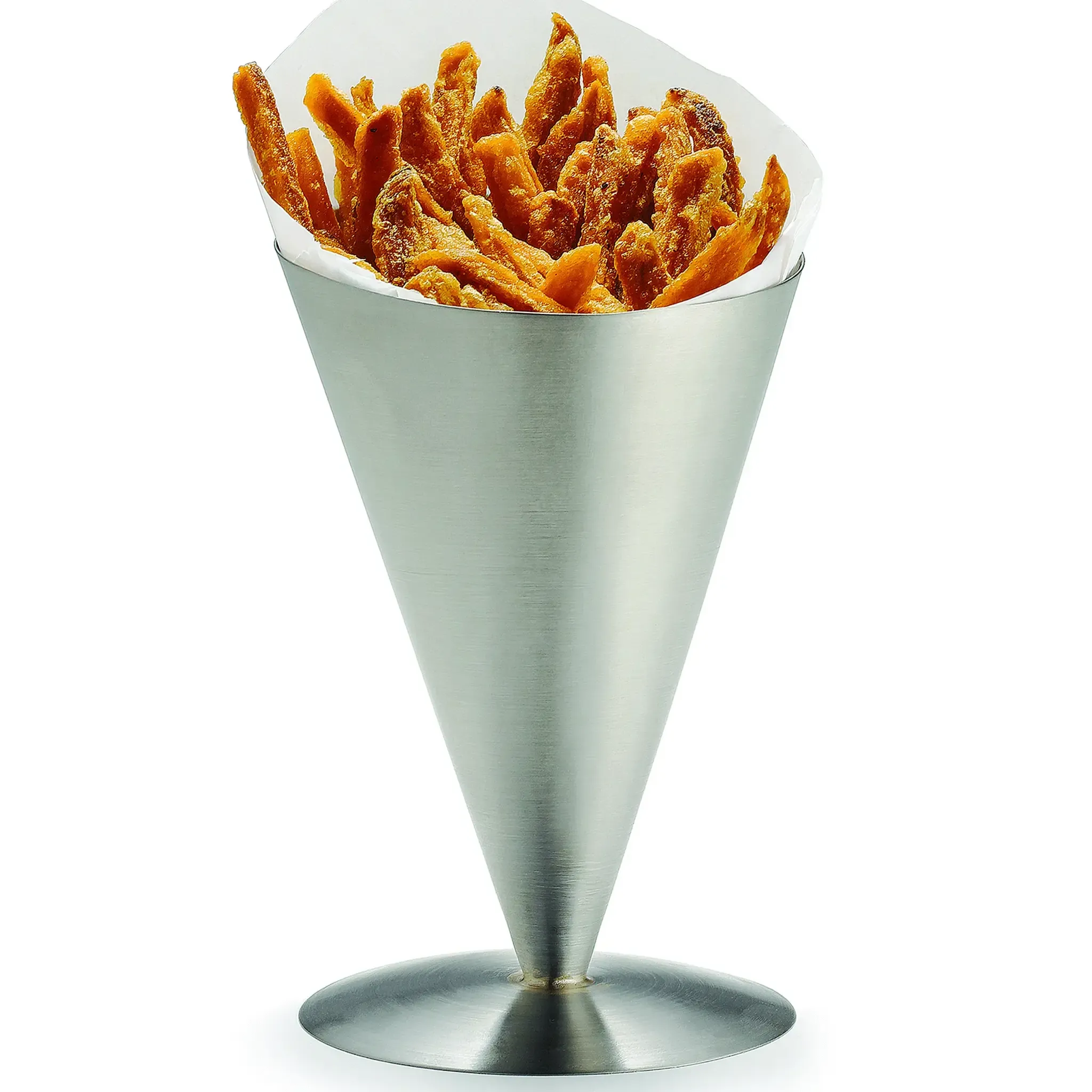 Premium tools for a successful setup with TableCraft Products, R57, Appetizers & Side Servers. Designed specifically for commercial restaurant use, these stainless steel cones/cups are a must-have for any establishment looking to elevate their appetizer and side serving game. The sleek stainless steel construction not only adds a touch of elegance to your presentation but also guarantees durability and longevity, making them perfect for busy restaurant environments. Whether you're serving crispy fries, delectable onion rings, or mouthwatering sliders, these appetizer and side servers will impress your customers and enhance their dining experience. The compact size and easy-to-hold design make them convenient for both customers and staff. Elevate your restaurant's appetizer and side game with TableCraft Products, R57, Appetizers & Side Servers.