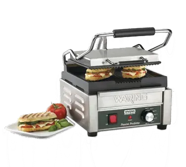 Serve with pride with the Waring WPG150 Sandwich/Panini Grill. This compact and efficient grill is perfect for commercial restaurant use. With a 9-1/4" x 9-3/4" cooking surface, it provides ample space to grill delicious paninis and sandwiches. The hinged auto-balancing top plate with heat resistant handles ensures even cooking and easy operation. The ribbed cast iron plates create beautiful grill marks and enhance the flavor of your sandwiches. The adjustable thermostat allows you to customize the cooking temperature up to 570F (300C), giving you full control over your culinary creations. The indicator lights make it easy to monitor the cooking process. The brushed stainless steel body and removable drip tray make cleaning a breeze. With its durability, versatility, and high-quality construction, the Waring WPG150 Sandwich/Panini Grill is a must-have for any commercial restaurant.
